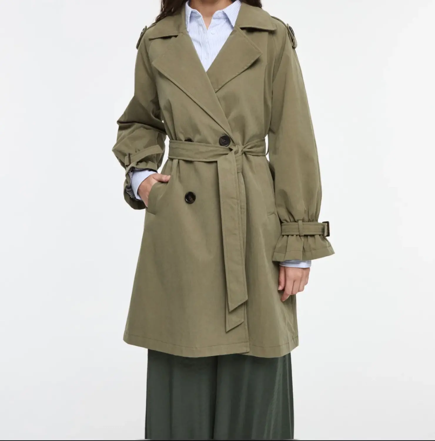 Gabardina de corte recto con diseño cruzado y cinturon ajustable a la cintura . Cuenta con cuello clasico y botones delanteros. Una prenda atemporal y ligera, ideal para entre tiempo.